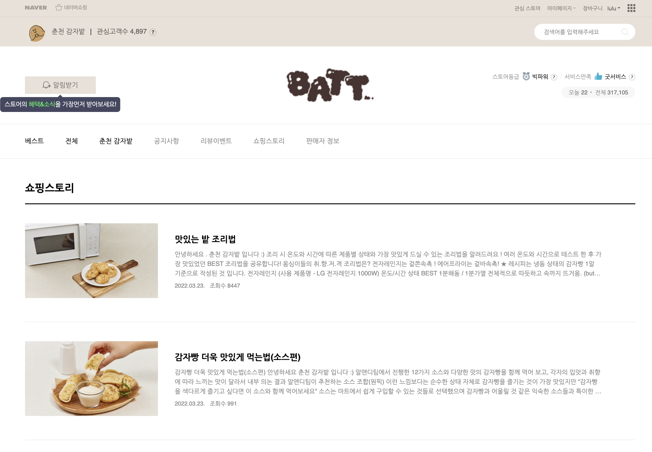 빅파워 스토어의 쇼핑스토리 활용 예시: 싸xx마을, x천x자밭 네이버 스토어